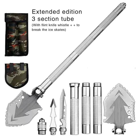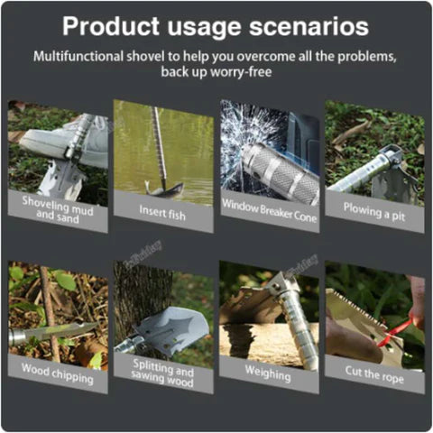 ¡La versátil caja de herramientas para exteriores es imprescindible para acampar! Con funciones como cavar, nivelar, cortar, serrar, hacer palanca e incluso encender fuego, es un ayudante práctico. Empaca tu tienda de campaña, saco de dormir y parrilla de barbacoa